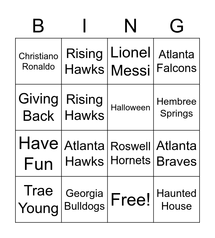 This bingo card has 17 words: Free!, Trae Young, Lionel Messi, Christiano Ronaldo, Atlanta Hawks, Atlanta Falcons, Atlanta Braves, Halloween, Hembree Springs, Rising Hawks, Georgia Bulldogs, Roswell Hornets, Giving Back, Rising Hawks, Have Fun, Get Better and Haunted House.