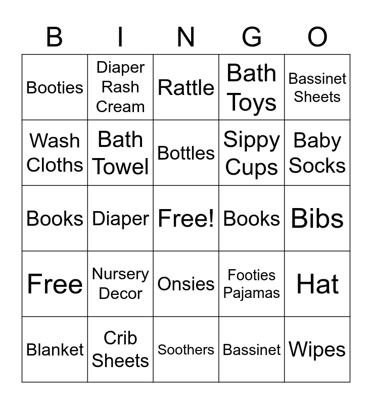 This bingo card has a free space and 24 words: Nursery Decor, Crib Sheets, Bottles, Blanket, Bassinet Sheets, Booties, Wash Cloths, Diaper Rash Cream, Books, Onsies, Sippy Cups, Books, Footies Pajamas, Hat, Bath Towel, Bassinet, Bibs, Rattle, Baby Socks, Diaper, Wipes, Free, Bath Toys and Soothers.