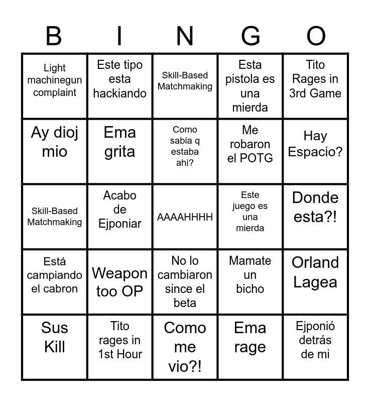 This bingo card has a free space and 24 words: Weapon too OP, Tito rages in 1st Hour, Como sabia q estaba ahi?, Sus Kill, Tito Rages in 3rd Game, Light machinegun complaint, Ay dioj mio, Este tipo esta hackiando, Este juego es una mierda, No lo cambiaron since el beta, Me robaron el POTG, Skill-Based Matchmaking, Mamate un bicho, Orland Lagea, Ema grita, Ema rage, Donde esta?!, Skill-Based Matchmaking, Hay Espacio?, Acabo de Ejponiar, Ejponió detrás de mi, Está campiando el cabron, Esta pistola es una mierda and Como me vio?!.