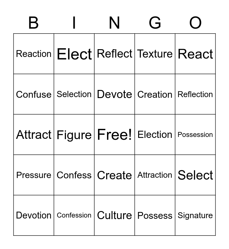 This bingo card has a free space and 24 words: Confess, Confession, Devote, Devotion, React, Reaction, Confuse, Elect, Election, Create, Creation, Attract, Attraction, Select, Selection, Possess, Possession, Reflect, Reflection, Figure, Signature, Pressure, Texture and Culture.