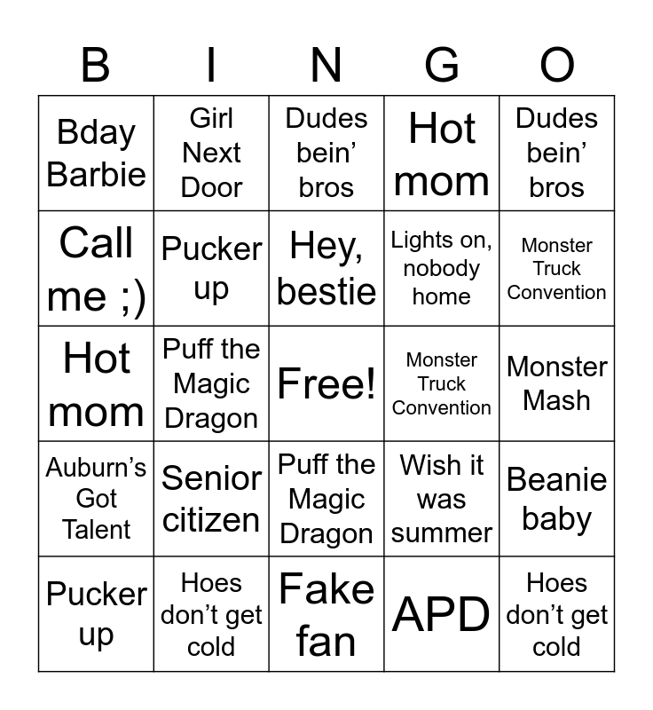⚠ This card has duplicate items: Wild Hogs (2), Hoes don’t get cold (2), Daddy Warbucks (2), Fake fan (2), Senior citizen (2), I’m Batman (2), Girl Next Door (2), Respect the Drip (2), Call me ;) (2), 69 (2), Pucker up (2), Hot mom (2), Beanie baby (2), Wish it was summer (2), Auburn’s Got Talent (2), Watch that line (2), Hey, bestie (2), Monster Truck Convention (2), War Eagle, brother! (2), Dudes bein’ bros (2), Puff the Magic Dragon (2), APD (2), Bday Barbie (2), Lights on, nobody home (2), Monster Mash (2)