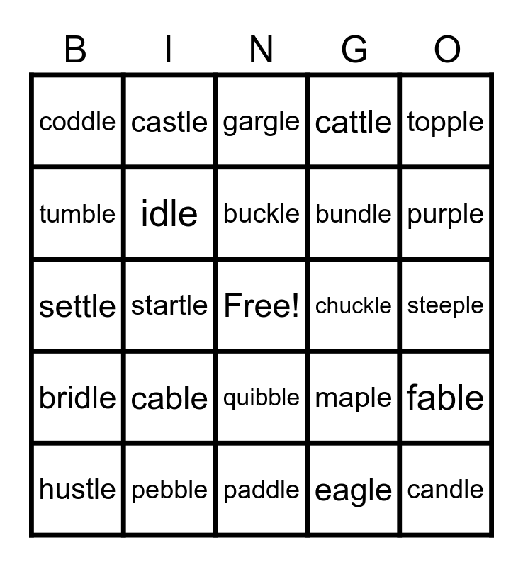 This bingo card has a free space and 24 words: cable, pebble, buckle, hustle, topple, coddle, tumble, castle, chuckle, quibble, bundle, settle, maple, fable, idle, eagle, steeple, gargle, purple, startle, candle, bridle, cattle and paddle.