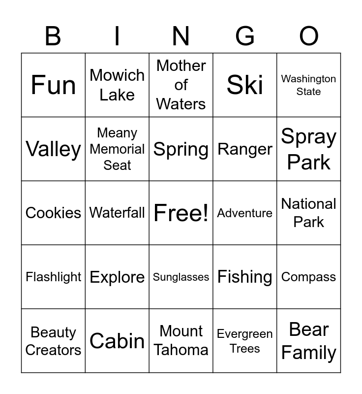 This bingo card has a free space and 49 words: Snowy Peak, Blueberries, Mount Rainier, Evergreen Trees, National Park, Lake, Mowich Lake, Trout, Ranger, Canoe, Valley, Waterfall, Fishing, Bear Family, Wildflowers, Hibernate, Mother of Waters, Adventure, Indian Henry, Fun, Cabin, Mount Tahoma, Ski, Washington State, Biking, Explore, Spring, Map, Compass, Flashlight, Water, Sunglasses, Pocket Knife, Candle, Beauty Creators, God Worshipers, snowshoe, Hiking, Spray Park, Bikes, Gobbler's Knob, Trailhead, Volcano, climbing, Cookies, Meany Memorial Seat, Fire, Civilian Conservation Corps and Alpine.