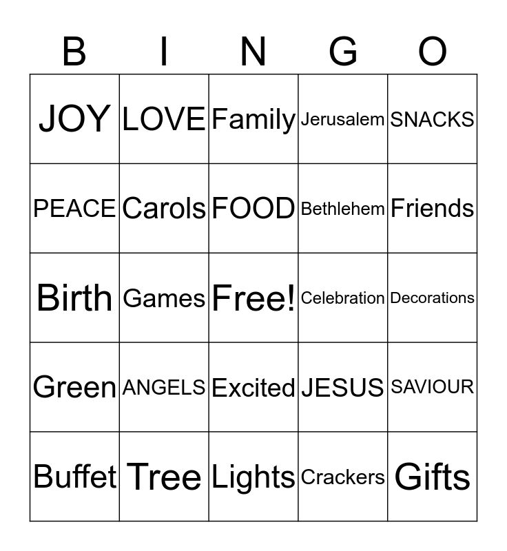 This bingo card has a free space and 24 words: ANGELS, Tree, FOOD, Buffet, SNACKS, JOY, PEACE, LOVE, Celebration, Excited, Bethlehem, Birth, JESUS, SAVIOUR, Carols, Crackers, Decorations, Family, Friends, Games, Gifts, Green, Jerusalem and Lights.
