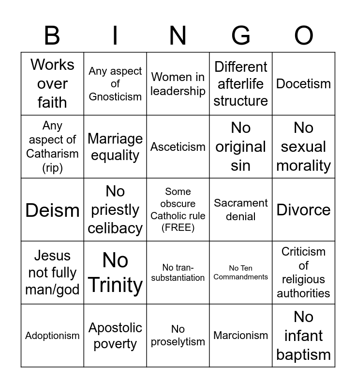 This bingo card has a free space and 24 words: No Trinity, Apostolic poverty, Asceticism, Adoptionism, Docetism, Works over faith, Any aspect of Catharism (rip), Any aspect of Gnosticism, Sacrament denial, No tran- substantiation, No original sin, Deism, No Ten Commandments, Criticism of religious authorities, Marriage equality, Marcionism, Divorce, Women in leadership, No sexual morality, No priestly celibacy, No infant baptism, Jesus not fully man/god, Different afterlife structure and No proselytism.