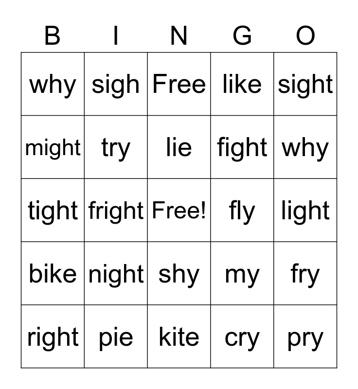 This bingo card has a free space and 24 words: night, pie, lie, right, sight, why, might, sigh, fly, shy, fight, tight, my, fry, try, cry, light, Free, why, fright, pry, bike, like and kite.