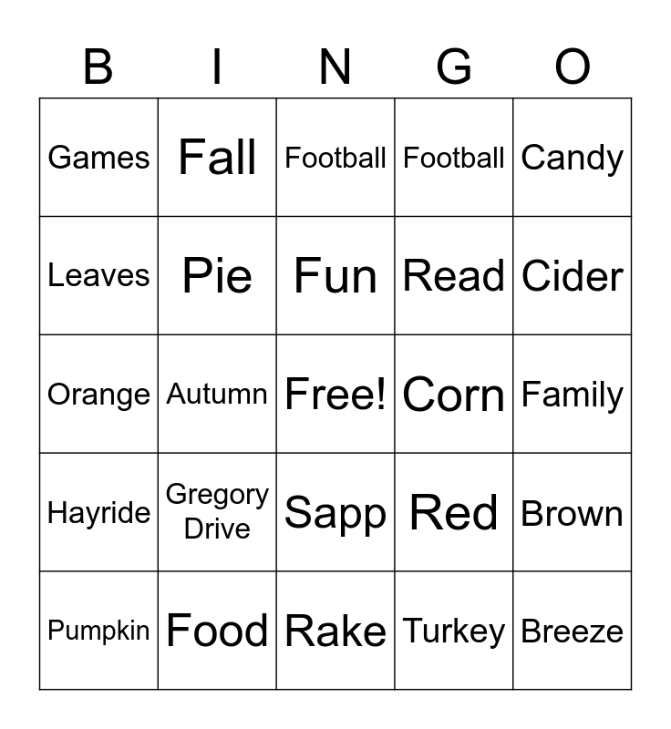 This bingo card has a free space and 24 words: Gregory Drive, Food, Fun, Pumpkin, Candy, Games, Leaves, Fall, Corn, Sapp, Read, Orange, Red, Brown, Pie, Turkey, Family, Football, Cider, Autumn, Breeze, Hayride, Football and Rake.