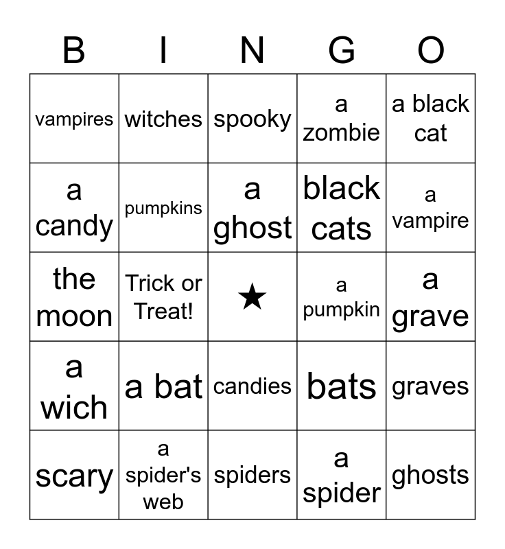 This bingo card has a free space and 24 words: a bat, a spider's web, a ghost, scary, a black cat, vampires, a candy, witches, a pumpkin, candies, black cats, the moon, bats, graves, pumpkins, a spider, a grave, spooky, a vampire, Trick or Treat!, ghosts, a wich, a zombie and spiders.
