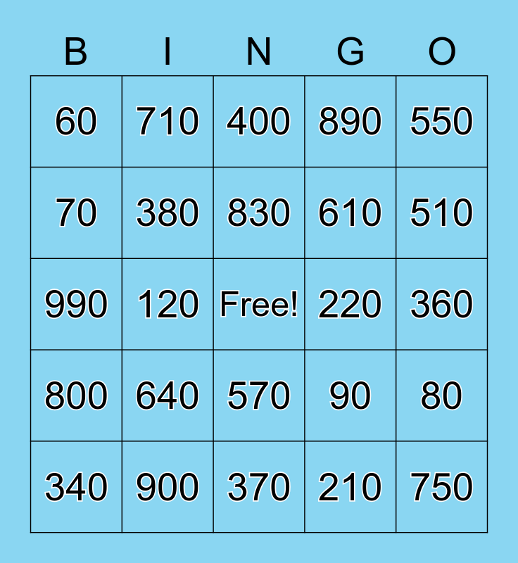This bingo card has a free space and 24 words: 640, 900, 830, 340, 550, 60, 70, 710, 220, 570, 610, 990, 90, 80, 380, 210, 360, 400, 510, 120, 750, 800, 890 and 370.