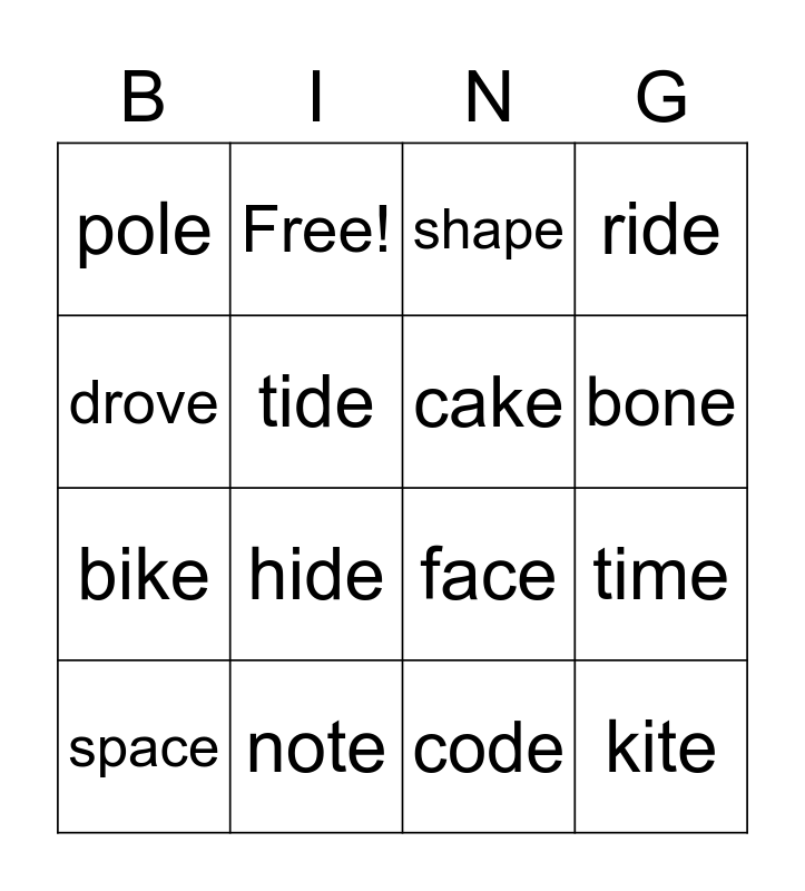 This bingo card has 19 words: face, game, shape, kite, time, drove, code, pole, Free!, bike, hide, tide, cake, note, space, home, ride, bone and like.