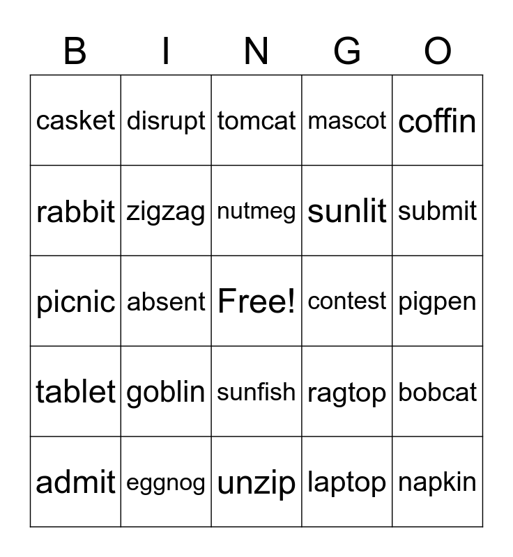 This bingo card has a free space and 24 words: goblin, eggnog, nutmeg, admit, coffin, casket, rabbit, disrupt, contest, sunfish, sunlit, picnic, ragtop, bobcat, zigzag, laptop, pigpen, tomcat, submit, absent, napkin, tablet, mascot and unzip.