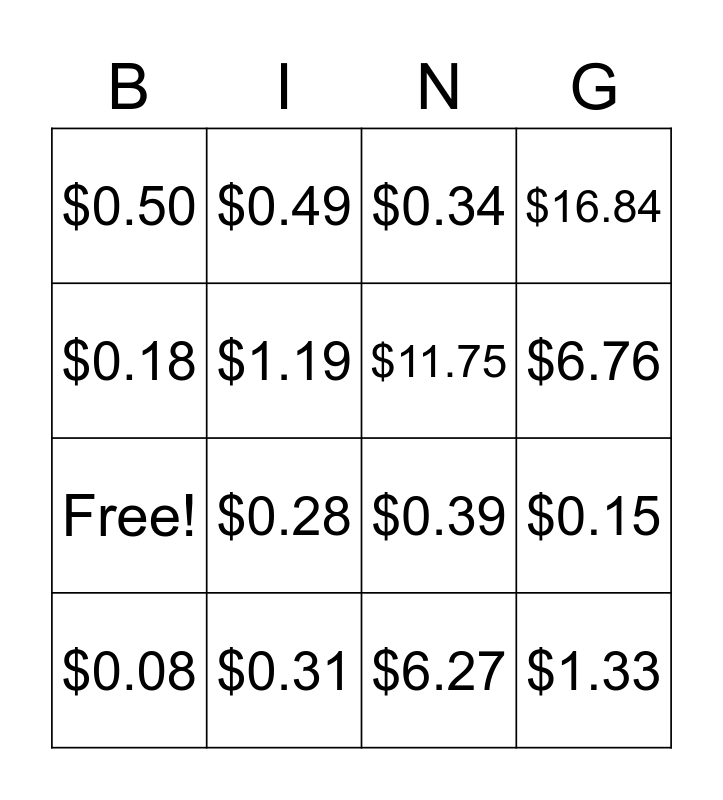 This bingo card has 20 words: $0.15, $0.22, $0.34, $0.46, $0.08, $0.18, $0.31, $0.50, Free!, $0.49, $0.28, $0.39, $1.19, $1.33, $11.75, $1.17, $6.76, $16.84, $6.27 and $17.32.