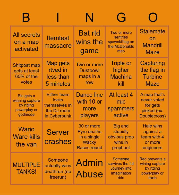 This bingo card has 25 words: Wario Ware kills the van, Someone actually wins deathrun (no freerun), Dance line with 10 or more players, Someone survives the full Journey into Imagination ride, Stalemate on Mandrill Maze, All secrets on a map activated, Itemtest massacre, Bat rtd wins the game, At least 4 mic spammers active, Hale wins against a team with 4 or more engineers, Shitpost map gets at least 60% of the votes, Map gets rtved in less than 5 minutes, Admin Abuse, Big and stupidly obvious prop wins in prophunt, Capturing the flag in Turbine Maze, MULTIPLE TANKS!, Either team locks themselves in the DJ room in Cyberpunk, Two or more Dustbowl maps in a row, Triple or higher Machina kill, A map that's never voted for gets picked (ex: Doublecross), Blu gets a winning capture by rtding powerplay or godmode, Server crashes, 30 or more Pyro deaths in a single Wacky Races round, Two or more sentries spawnkilling on the McDonalds map and Red prevents a wining capture by rtding powerplay or toxic.