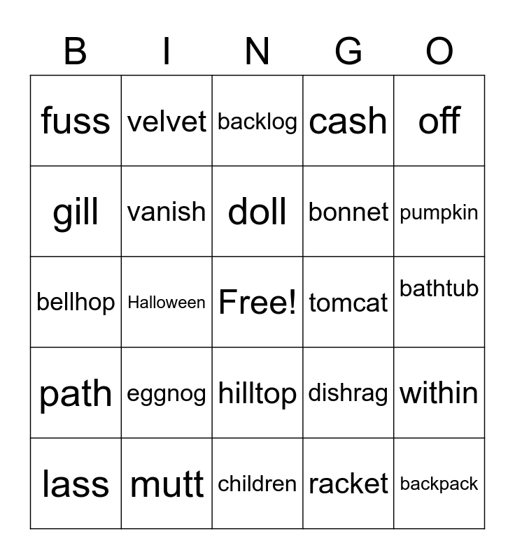 This bingo card has a free space and 24 words: eggnog, mutt, doll, lass, off, fuss, gill, velvet, tomcat, hilltop, bonnet, bellhop, dishrag, within, vanish, racket, bathtub, backlog, pumpkin, Halloween, backpack, path, cash and children.