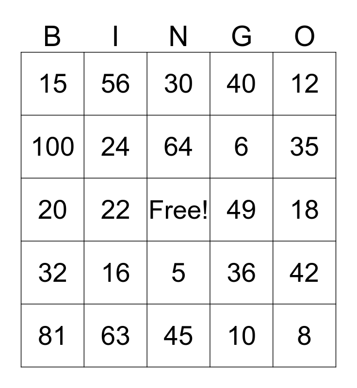 This bingo card has a free space and 24 words: 16, 63, 64, 81, 12, 15, 100, 56, 49, 5, 6, 20, 36, 42, 24, 10, 18, 30, 35, 22, 8, 32, 40 and 45.