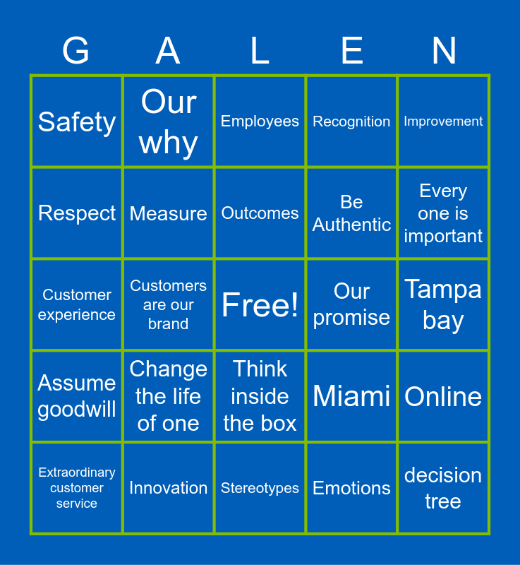 This bingo card has a free space and 101 words: Culture, Leaders, Improvement, Bullseye, WOW, exceeds expectations, Customers, Mission, Vision, Here we grow, Scale, HCA, pure nursing, 360 analysis, Over focus, Yes and, Assume goodwill, Good ideas come from anywhere, Reputation, Building the lamp, Culture by design, Organizational vibrancy, Diversity, Equity, Inclusion, Every one is important, Recognition, Change the life of one, Intentional, ICARE, Our why, Employees, Creativity, Innovation, Extra inch, Think inside the box, Satisfaction is dangerous, Needs and wants, Emotions, Stereotypes, Off task - on purpose, Extraordinary customer service, Brand loyalty, Extraordinary education, NURSE, decision tree, Shared values, Celebrate one another, Inclusivity, Character, Accountability, Respect, Excellence, Honoring our past, College of opportunity, Commitment, Lead by example, Free space is lamp icon, Indisputable excellence, Listen and learn, Measure, Act, Remeasure, Acknowledge, Share, Be Authentic, Compassionate care, Customers are our brand, Innovation, Technology, Student support, Honor our history, Safety, Compliance, Outcomes, Customer experience, Efficiency, NCLEX, PN/VV, Bridge, MSN, BSN, Our promise, Austin, Asheville, Cincinnati, Tampa bay, Gainesville, Hazard, Louisville, Miami, Myrtle beach, Nashville, Pikeville, Richmond, Online, San Antonio, Sarasota, Dallas, Houston and Arts & Sciences.