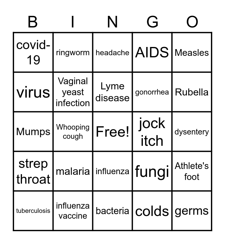 This bingo card has a free space and 25 words: malaria, bacteria, Lyme disease, tuberculosis, Measles, covid-19, virus, ringworm, jock itch, influenza, gonorrhea, Mumps, fungi, Athlete's foot, Vaginal yeast infection, protozoa, dysentery, headache, Rubella, Whooping cough, germs, influenza vaccine, strep throat, AIDS and colds.