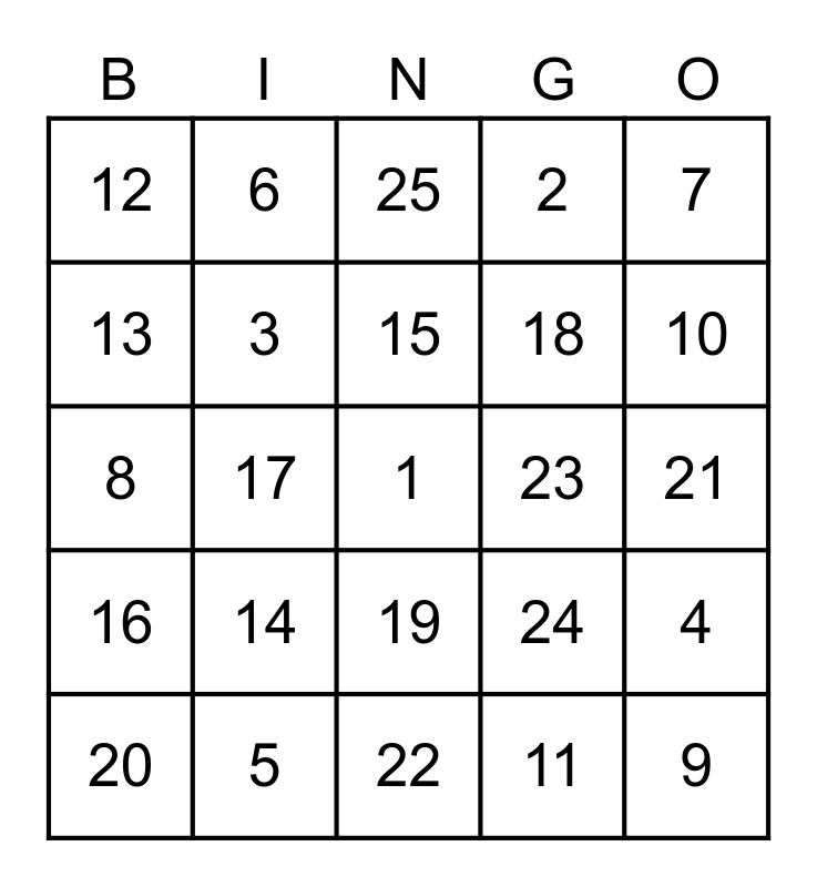 This bingo card has a free space and 24 words: 14, 5, 15, 20, 7, 12, 13, 6, 23, 19, 18, 8, 24, 4, 3, 11, 21, 25, 10, 17, 9, 16, 2 and 22.