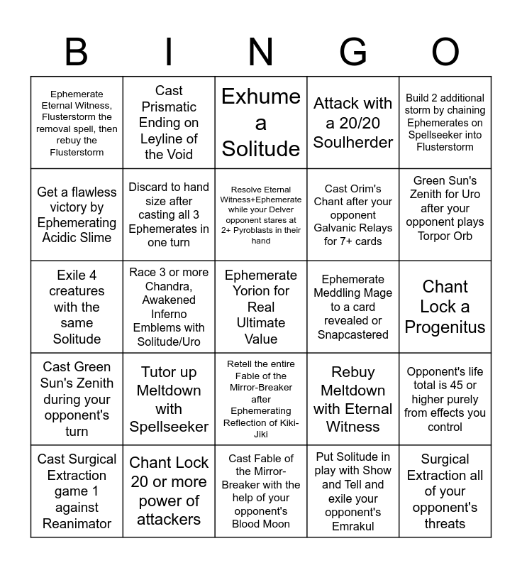 This bingo card has a free space and 24 words: Cast Surgical Extraction game 1 against Reanimator, Tutor up Meltdown with Spellseeker, Resolve Eternal Witness+Ephemerate while your Delver opponent stares at 2+ Pyroblasts in their hand, Put Solitude in play with Show and Tell and exile your opponent's Emrakul, Build 2 additional storm by chaining Ephemerates on Spellseeker into Flusterstorm, Ephemerate Eternal Witness, Flusterstorm the removal spell, then rebuy the Flusterstorm, Cast Prismatic Ending on Leyline of the Void, Exhume a Solitude, Ephemerate Meddling Mage to a card revealed or Snapcastered, Chant Lock a Progenitus, Exile 4 creatures with the same Solitude, Discard to hand size after casting all 3 Ephemerates in one turn, Rebuy Meltdown with Eternal Witness, Opponent's life total is 45 or higher purely from effects you control, Get a flawless victory by Ephemerating Acidic Slime, Chant Lock 20 or more power of attackers, Cast Fable of the Mirror-Breaker with the help of your opponent's Blood Moon, Attack with a 20/20 Soulherder, Green Sun's Zenith for Uro after your opponent plays Torpor Orb, Cast Green Sun's Zenith during your opponent's turn, Race 3 or more Chandra, Awakened Inferno Emblems with Solitude/Uro, Retell the entire Fable of the Mirror-Breaker after Ephemerating Reflection of Kiki-Jiki, Cast Orim's Chant after your opponent Galvanic Relays for 7+ cards and Surgical Extraction all of your opponent's threats.