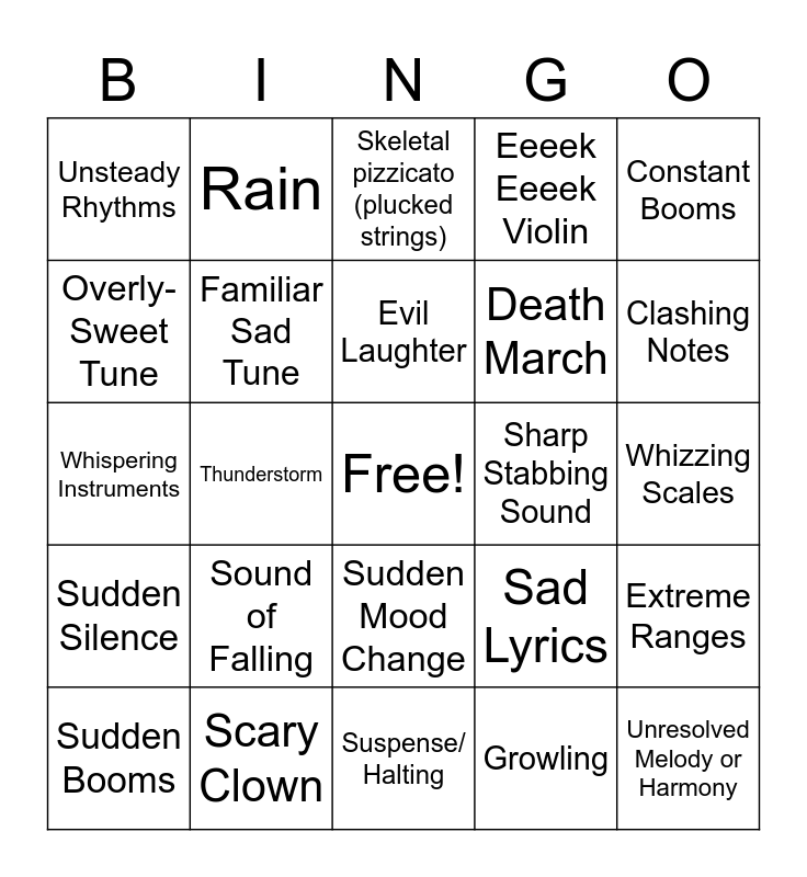 This bingo card has a free space and 52 words: Misty Strings, Unresolved Melody or Harmony, Footsteps, Suspense/ Halting, Sound of Falling, Clock Chime, Rain, Breathing, Overly-Sweet Tune, Off-balance Rhythms, Familiar Sad Tune, Howling, Extreme Ranges, Sad Lyrics, Echo, Moaning, Evil Laughter, Sharp Stabbing Sound, Conversation/ Argument, Constant Booms, Thunderstorm, Growling, Unsteady Rhythms, Death March, Rustling, Screech Violin, Howling/ Whistling Wind, Moaning Lower Strings, Clashing Notes, Angry Choir, Lonely Soloist, Eeeek Eeeek Violin, Whispered Singing, Sad Tune, Skeletal Percussion, Skeletal pizzicato (plucked strings), Scary Clown, Blast of Brass, Whining, Bended Notes, Repeated Tune Fragment, Pounding Drums, Whizzing Scales, Sudden Silence, Creaking (wood or violin bows), Sudden Mood Change, Crunching/ Scraping, Tremolo (shivering bowing), Whispering Instruments, Rattling, Empty Space in Music, Sudden Booms and Distant Booms.