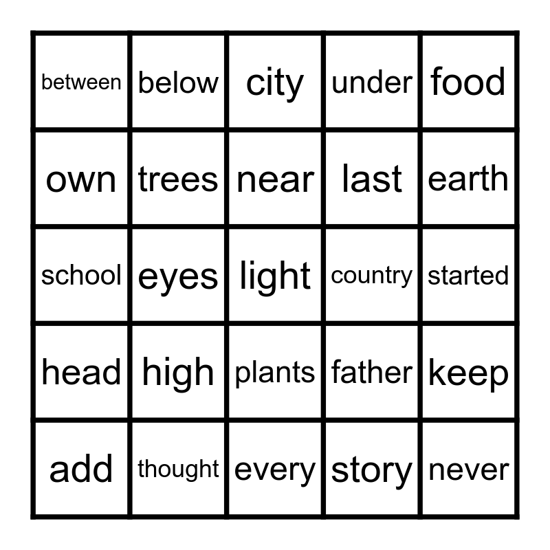 This bingo card has 25 words: high, every, near, add, food, between, own, below, country, plants, last, school, father, keep, trees, never, started, city, earth, eyes, light, thought, head, under and story.