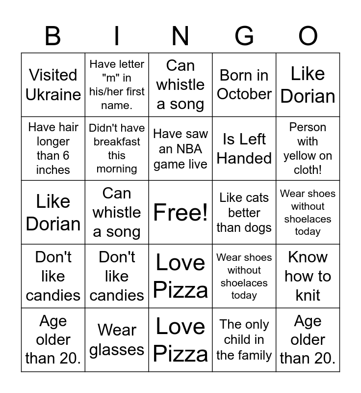 ⚠ This card has duplicate items: Person with yellow on cloth! (2), Age older than 20. (2), Never been to Wonderland. (2), Love Pizza (2), Don't like candies (2), Wearing contact lens (2), Have letter "m" in his/her first name. (2), Can recite one Bible verse (2), Have hair longer than 6 inches (2), Wear glasses (2), Didn't have breakfast this morning (2), Born in October (2), Know how to knit (2), Wear shoes without shoelaces today (2), Is a summer baby (2), Can the tongue (2), Have saw an NBA game live (2), Like cats better than dogs (2), Like skiing (2), Like Dorian (2), Can whistle a song (2), The only child in the family (2), Is Left Handed (2), Won 1st place in anything (2)