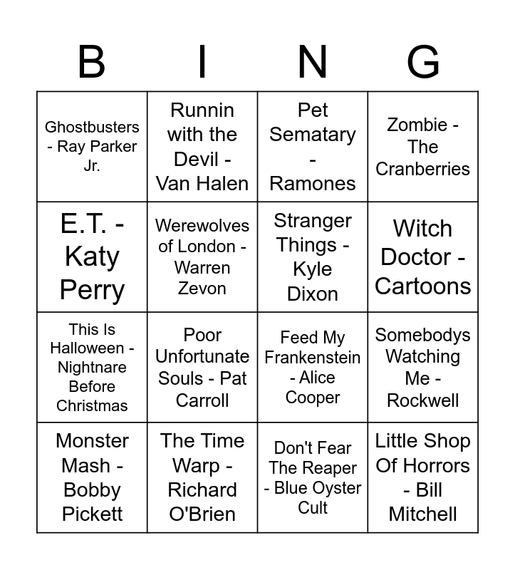 This bingo card has 34 words: Everybody - Backstreet Boys, Sweet but Psycho - Ava Max, Hungry Like the Wolf - Duran Duran, Addams Family - Addams Family, Little Shop Of Horrors - Bill Mitchell, Stranger Things - Kyle Dixon, E.T. - Katy Perry, Purple People Eater - Sheb Wooley, Runnin with the Devil - Van Halen, Halloween - Halloween, Witch Doctor - Cartoons, Pet Sematary - Ramones, Oogie Boogies Song - Ed Ivory, I Want Candy - Bow Wow Wow, The Time Warp - Richard O'Brien, Poor Unfortunate Souls - Pat Carroll, Things That Go Bump In The Night - allSTARS, Feed My Frankenstein - Alice Cooper, Heads Will Roll - Yeah Yeah Yeahs, Scream and Shout - Will I Am, Thriller - Michael Jackson, I Put a Spell on You - PattyCake, Ghostbusters - Ray Parker Jr., Don't Fear The Reaper - Blue Oyster Cult, She Wolf - Shakira, Monster Mash - Bobby Pickett, Zombie - The Cranberries, Scooby Doo - Scooby Doo, This Is Halloween - Nightnare Before Christmas, Werewolves of London - Warren Zevon, Spooky Scary Skeletons - Andrew Gold, Somebodys Watching Me - Rockwell, Dragula - Rob Zombie and Disturbia - Rihanna.