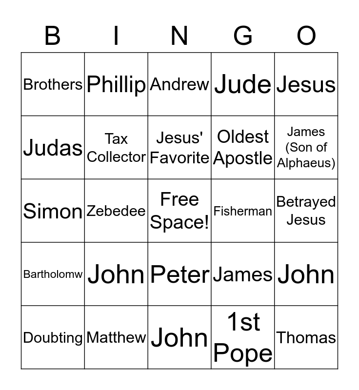 This bingo card has a free space and 24 words: John, Matthew, Jesus' Favorite, Doubting, Jesus, Brothers, Judas, Phillip, Fisherman, Peter, Oldest Apostle, Simon, James, John, Tax Collector, 1st Pope, Betrayed Jesus, Andrew, James (Son of Alphaeus), Zebedee, Thomas, Bartholomw, Jude and John.