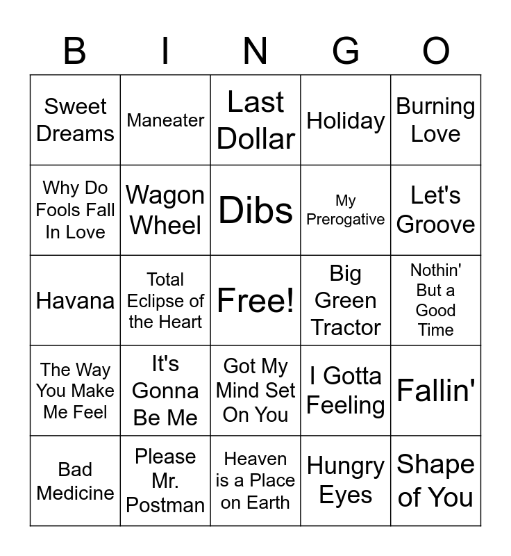 This bingo card has a free space and 24 words: It's Gonna Be Me, Please Mr. Postman, Dibs, Bad Medicine, Burning Love, Sweet Dreams, Why Do Fools Fall In Love, Maneater, Big Green Tractor, Got My Mind Set On You, My Prerogative, Havana, I Gotta Feeling, Fallin', Wagon Wheel, Hungry Eyes, Nothin' But a Good Time, Last Dollar, Let's Groove, Total Eclipse of the Heart, Shape of You, The Way You Make Me Feel, Holiday and Heaven is a Place on Earth.