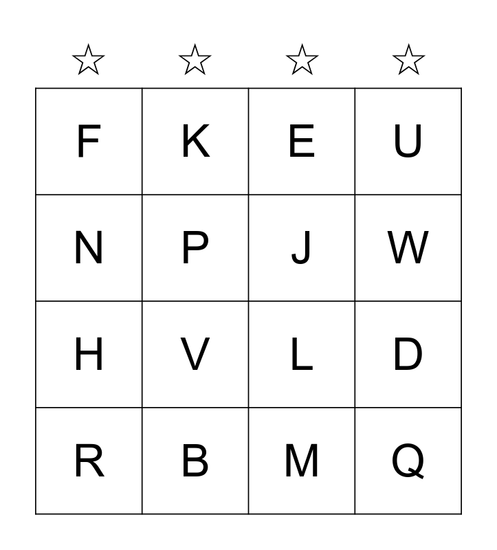 This bingo card has 16 words: B, D, E, F, H, K, L, M, N, P, R, U, V, W, J and Q.