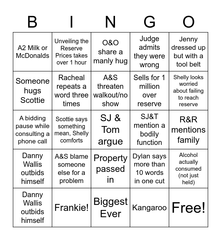 This bingo card has 33 words: Free!, "Country" styling mentioned, Scottie says something mean, Shelly comforts, Someone other than A&S or Scottie say "Biggest House", Danny Wallis outbids himself, Racheal repeats a word three times, Jenny dressed up but with a tool belt, Danny Wallis outbids himself, Unveiling the Reserve Prices takes over 1 hour, "To be honest", A&S threaten walkout/no show, O&O share a manly hug, Tears, Sustainability, SJ&T mention a bodily function, Shelly looks worried about failing to reach reserve, Frankie!, A bidding pause while consulting a phone call, A&S blame someone else for a problem, Dylan says more than 10 words in one cut, Property passed in, Mud, A2 Milk or McDonalds, R&R mentions family, Biggest Ever, SJ & Tom argue, Judge admits they were wrong, Sells for 1 million over reserve, Someone hugs Scottie, Alcohol actually consumed (not just held), Helicopter, Kangaroo and "Shocked" faces about reserve prices.