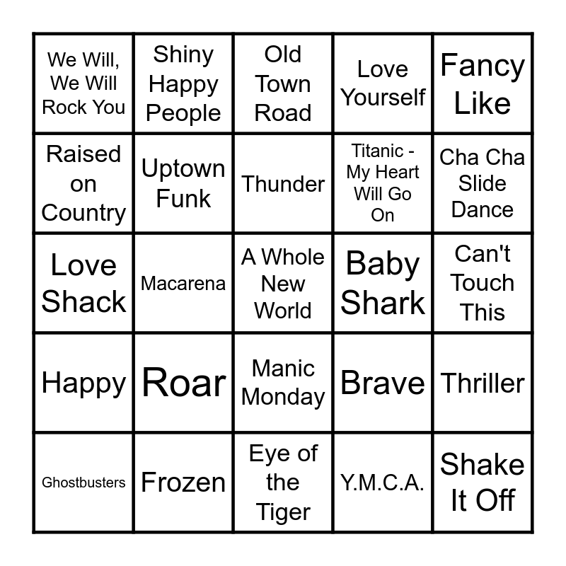 This bingo card has 25 words: Roar, Eye of the Tiger, Thunder, Ghostbusters, Fancy Like, We Will, We Will Rock You, Raised on Country, Shiny Happy People, Baby Shark, Manic Monday, Titanic - My Heart Will Go On, Love Shack, Brave, Thriller, Uptown Funk, Shake It Off, Can't Touch This, Old Town Road, Cha Cha Slide Dance, Macarena, A Whole New World, Frozen, Happy, Love Yourself and Y.M.C.A..