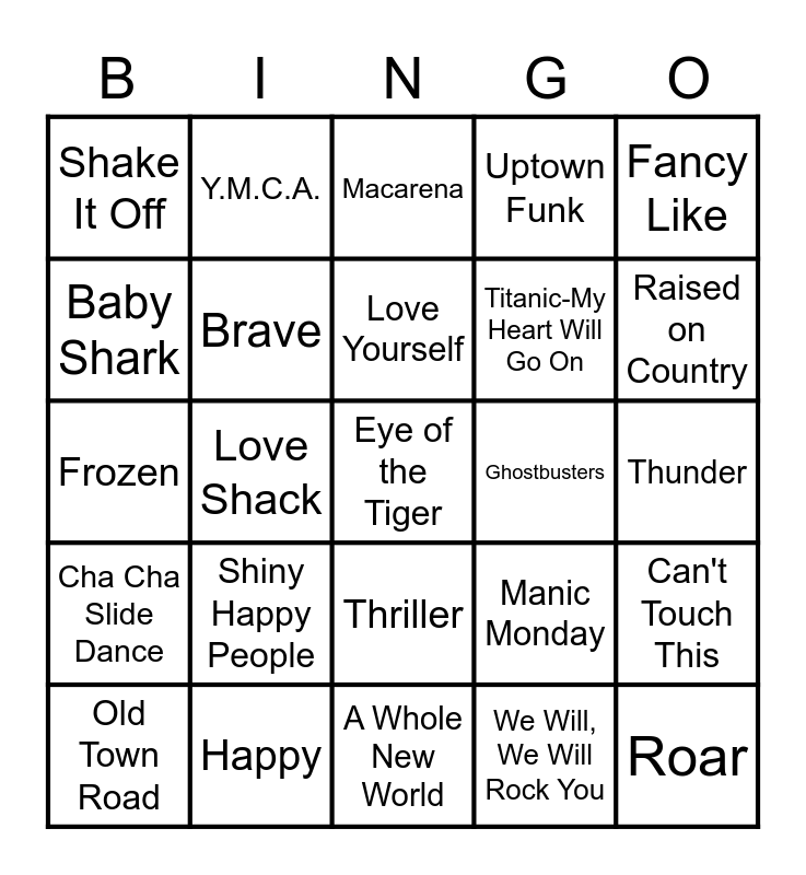 This bingo card has 25 words: Shiny Happy People, A Whole New World, Love Yourself, Old Town Road, Fancy Like, Shake It Off, Baby Shark, Y.M.C.A., Ghostbusters, Thriller, Titanic-My Heart Will Go On, Frozen, Manic Monday, Can't Touch This, Brave, Roar, Thunder, Macarena, Raised on Country, Love Shack, Eye of the Tiger, Happy, Cha Cha Slide Dance, Uptown Funk and We Will, We Will Rock You.