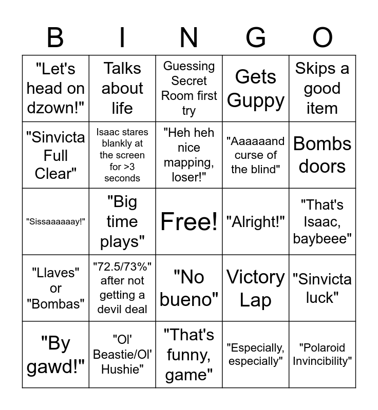 This bingo card has a free space and 24 words: "72.5/73%" after not getting a devil deal, "Ol' Beastie/Ol' Hushie", "Heh heh nice mapping, loser!", "By gawd!", Skips a good item, "Let's head on dzown!", "Sinvicta Full Clear", Talks about life, "Alright!", "No bueno", "Aaaaaand curse of the blind", "Sissaaaaaay!", Victory Lap, "Sinvicta luck", Isaac stares blankly at the screen for >3 seconds, "Especially, especially", "That's Isaac, baybeee", Guessing Secret Room first try, Bombs doors, "Big time plays", "Polaroid Invincibility", "Llaves" or "Bombas", Gets Guppy and "That's funny, game".