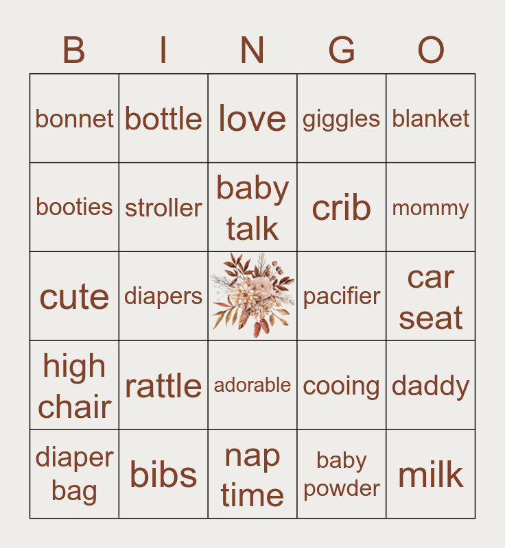This bingo card has a free space and 26 words: adorable, baby powder, baby talk, bibs, blanket, bonnet, booties, bottle, car seat, cooing, crib, cute, daddy, diaper bag, diapers, family, giggles, high chair, love, milk, mommy, nap time, pacifier, rattle, stroller and teething ring.
