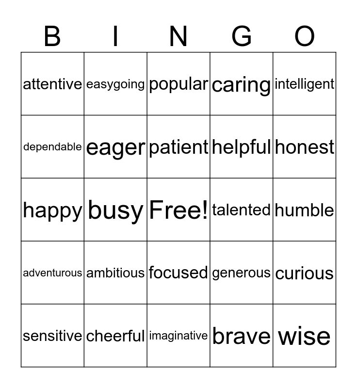 This bingo card has a free space and 24 words: ambitious, cheerful, patient, sensitive, intelligent, attentive, dependable, easygoing, talented, focused, helpful, happy, generous, curious, eager, brave, humble, popular, honest, busy, wise, adventurous, caring and imaginative.