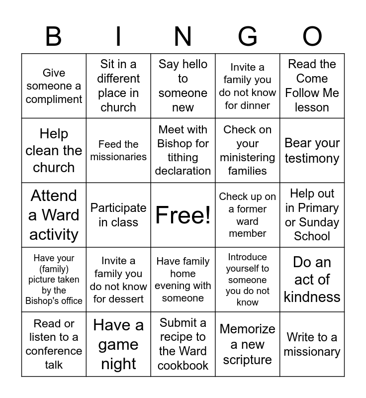 This bingo card has a free space and 24 words: Invite a family you do not know for dessert, Have a game night, Meet with Bishop for tithing declaration, Read or listen to a conference talk, Read the Come Follow Me lesson, Give someone a compliment, Help clean the church, Sit in a different place in church, Check up on a former ward member, Have family home evening with someone, Check on your ministering families, Attend a Ward activity, Introduce yourself to someone you do not know, Do an act of kindness, Feed the missionaries, Memorize a new scripture, Help out in Primary or Sunday School, Say hello to someone new, Bear your testimony, Participate in class, Write to a missionary, Have your (family) picture taken by the Bishop's office, Invite a family you do not know for dinner and Submit a recipe to the Ward cookbook.