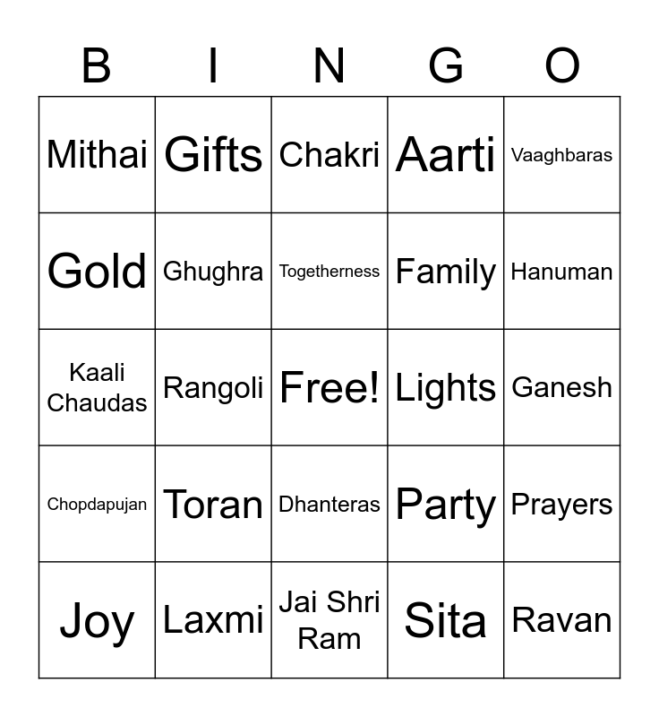 This bingo card has a free space and 29 words: Joy, Diyas, Rangoli, Firecrackers, Mithai, Chakri, Ghughra, Toran, Lights, Laxmi, Ganesh, Ravan, Jai Shri Ram, Sita, Hanuman, Flowers, Dhanteras, Chopdapujan, Vaaghbaras, Kaali Chaudas, Party, Celebration, Family, Gold, Aarti, Gifts, Prayers, Togetherness and Sparklers.