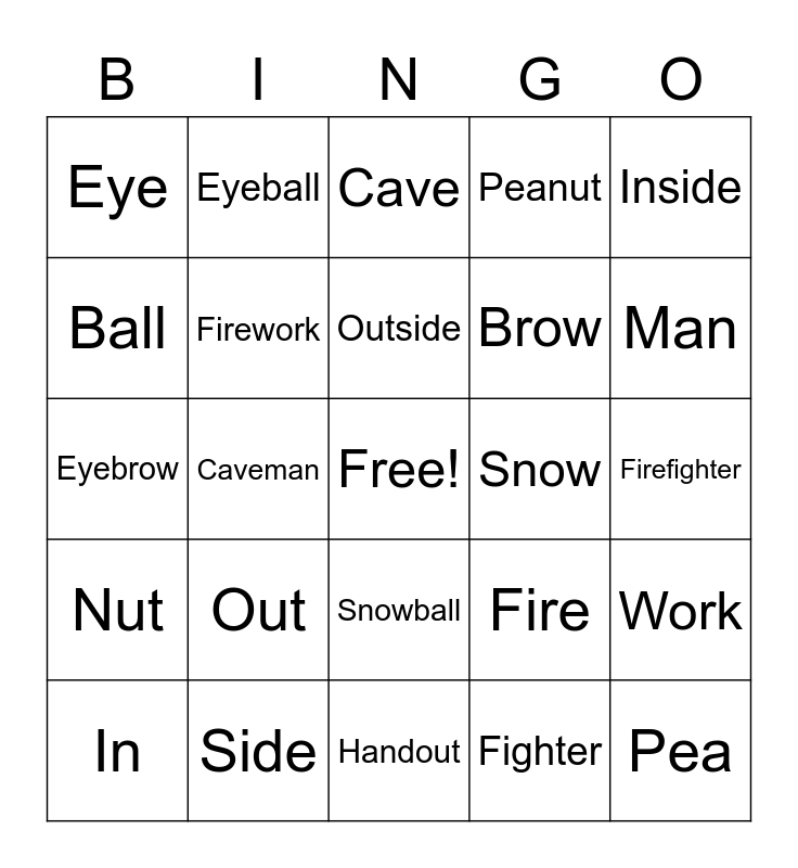 This bingo card has a free space and 24 words: Out, Side, Outside, In, Inside, Eye, Ball, Eyeball, Snow, Snowball, Brow, Eyebrow, Fire, Work, Firework, Fighter, Firefighter, Cave, Man, Caveman, Pea, Nut, Peanut and Handout.