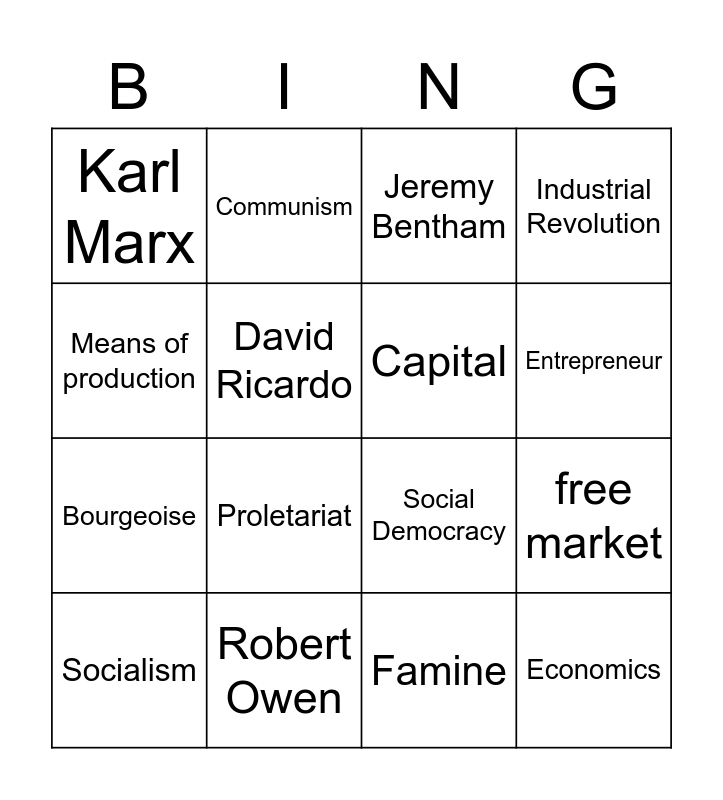 This bingo card has 20 words: free market, Thomas Malthus, Jeremy Bentham, Utilitarinaism, Socialism, Means of production, Robert Owen, Karl Marx, Bourgeoise, Communism, Proletariat, Social Democracy, David Ricardo, Economics, Capital, Lassiez-Faire, Entrepreneur, Industrial Revolution, Famine and Utopian.