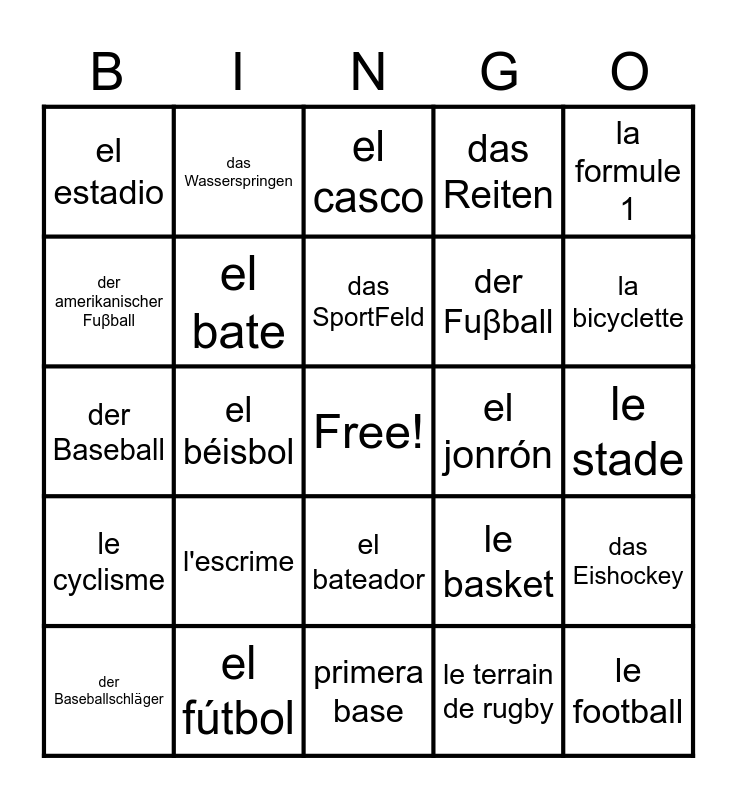 This bingo card has a free space and 30 words: el fútbol, el fútbol americano, el béisbol, el ciclismo, el estadio, el casco, el bate, el bateador, el jonrón, primera base, le stade, le football, le terrain de rugby, le casque, la bicyclette, le rugby, le basket, le cyclisme, l'escrime, la formule 1, der Baseball, der Kajak, das Wasserspringen, der Fuβball, der amerikanischer Fuβball, das Reiten, das Eishockey, der Baseballschlӓger, das SportFeld and springen.