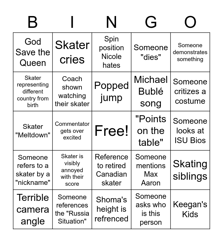 This bingo card has a free space and 33 words: Beth's "list", Skater falls on non-jump element, Commentator gets over excited, "The complete package", Someone refers to a skater by a "nickname", Coach shown watching their skater, Someone demonstrates something, Terrible camera angle, Skater cries, Opens/closes with #DramaticReach, Popped jump, Spin position Nicole hates, Clean program (not dance), "Playing it safe", "Points on the table", Someone critizes a costume, Someone references the "Russia Situation", Skater "Meltdown", Skater is visibly annoyed with their score, Someone mentions Max Aaron, Reference to retired Canadian skater, Jump with hand(s) above the head, God Save the Queen, Someone looks at ISU Bios, Shoma's height is refrenced, Keegan's Kids, Someone "dies", Michael Bublé song, Skater representing different country from birth, Skating siblings, Beth gives inside info, Someone asks who is this person and Man wears tank top.