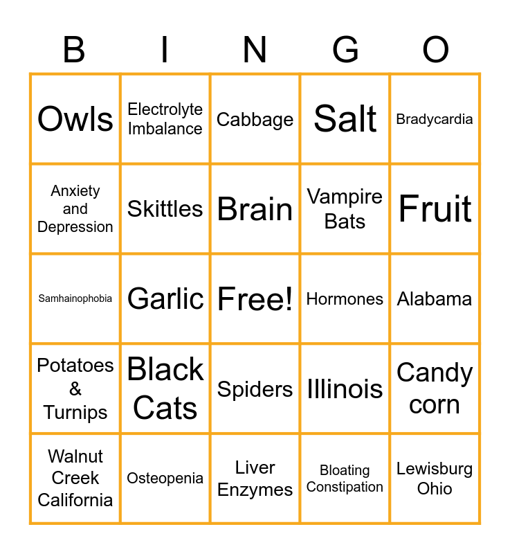 This bingo card has a free space and 27 words: Anemia, Osteopenia, Brain, Bloating Constipation, Bradycardia, Anxiety and Depression, Electrolyte Imbalance, Liver Enzymes, Hormones, Candy corn, Potatoes & Turnips, Skittles, Illinois, Lewisburg Ohio, Samhainophobia, Scotland & Ireland, Cabbage, Salt, Alabama, Owls, Black Cats, Spiders, Vampire Bats, Fruit, Walnut Creek California, Garlic and Apples.