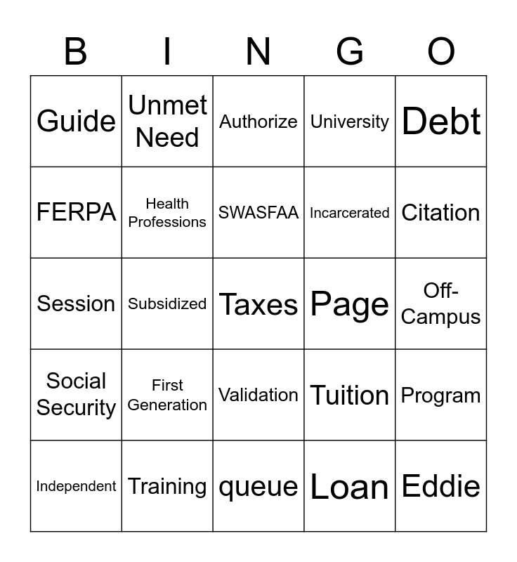 This bingo card has 131 words: Books, Unmet Need, Expected Family Contribution, Verification, Regulation, Federal Taxes, Social Security, Parent's, Scholarship, Open Enrollment, Full Time, Dead Line, Free!, Citizenship, Date of Birth, Application, Loan, Advisor, Community College, Dependent, Independent, Taxes, Incarcerated, Enrollment, Program, Undocumented/ DACA, Subsidized, Campus, Academic, Calendar, University, Program, Citation, Eddie, Audra, LaTora, Joellen, Lori, Director, Emily, SWASFAA, NMASFAA, TASFAA, Student, Electronic Data Exchange, Upload, Processing, Team, Document, Computer, Date, Parameter, External, Third Party, Search, COVID, Emergency, SQL, Test, Training, Boot Camp, Biden, Fresh Start, Verification, Packet, Award Letter, Missing Information, Conversion, Session, Duration, Validation, Full-Time, Pell Grant, Print, Login, Passward, CPS, Batch, Social Security, Google, email, Whova, Guide, First Generation, Index, Blank, Page, Credentialing, queue, status, Password, FSAID, StudentAid.gov, Office, Registrar, Transcript, Debt, Forgiveness, FERPA, Bursar/ Business Office, Cancellation, Authorize, Certificate, Diploma, Graduate, Housing, Off-Campus, Undergraduate, Independent, Residency, Health Professions, 4-year Public, Need Analysis, Graduation, part-time, Pell Chart, EFC, Work Study, Student Employment, Payment, Loan, Military, Veteran, International, Abroad, Fees, Tuition, Room and Board, Computer, Supplies and FAFSA.