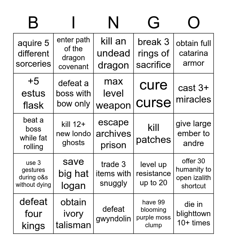 This bingo card has 25 words: save big hat logan, defeat gwyndolin, max level weapon, defeat four kings, obtain full catarina armor, aquire 5 different sorceries, +5 estus flask, enter path of the dragon covenant, kill patches, trade 3 items with snuggly, cure curse, beat a boss while fat rolling, level up resistance up to 20, offer 30 humanity to open izalith shortcut, defeat a boss with bow only, die in blighttown 10+ times, give large ember to andre, kill an undead dragon, cast 3+ miracles, kill 12+ new londo ghosts, escape archives prison, obtain ivory talisman, use 3 gestures during o&s without dying, break 3 rings of sacrifice and have 99 blooming purple moss clump.