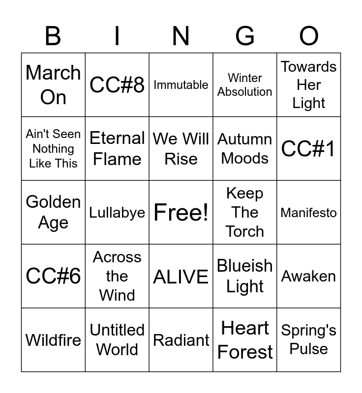 This bingo card has a free space and 24 words: Across the Wind, Untitled World, We Will Rise, Wildfire, Towards Her Light, March On, Ain't Seen Nothing Like This, CC#8, Keep The Torch, ALIVE, Autumn Moods, Golden Age, Blueish Light, Awaken, Eternal Flame, Heart Forest, Manifesto, Immutable, CC#1, Lullabye, Spring's Pulse, CC#6, Winter Absolution and Radiant.