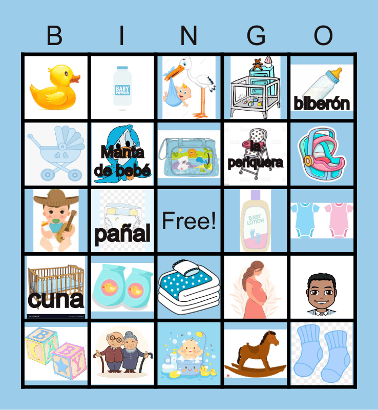This bingo card has 33 images, a free space and 7 words: Traqueteo, móvil, pañal, cuna, Manta de bebé, biberón and la periquera.