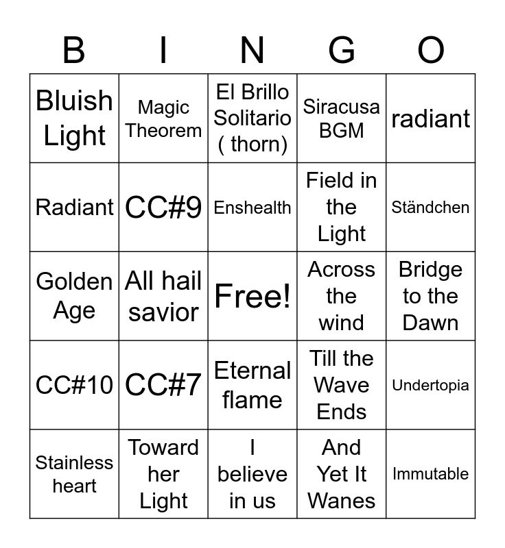 This bingo card has a free space and 28 words: Undertopia, Revel in the Real, Field in the Light, And Yet It Wanes, Radiant, El Brillo Solitario ( thorn), Magic Theorem, CC#10, Across the wind, Stainless heart, Golden Age, Siracusa BGM, Toward her Light, I believe in us, Ständchen, Awaken, CC#7, CC#9, Enshealth, Eternal flame, Bluish Light, Rapier, Immutable, All hail savior, Bridge to the Dawn, Till the Wave Ends, radiant and CC#9.