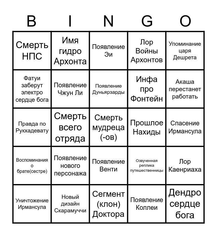 This bingo card has a free space and 30 words: Новый дизайн Скарамуччи, Смерть персонажа из отряда, Смерть всего отряда, Пробная Нахида, Смерть НПС, Появление Эи, Появление Чжун Ли, Появление Венти, Прошлое Нахиды, Сегмент (клон) Доктора, Спасение Ирмансула, Дендро сердце бога, Появление Коллеи, Новый квестовый предмет, Акаша перестанет работать, Появление персонажа из другого региона, Озвученная реплика путешественницы, Воспоминания о брате(сестре), Появление нового персонажа, Упоминание царя Дешрета, Правда по Рукхадевату, Упоминание предвестника фатуи (кроме Скары и Доктора), Имя гидро Архонта, Инфа про Фонтейн, Фатуи заберут электро сердце бога, Лор Войны Архонтов, Лор Каенриаха, Уничтожение Ирмансула, Появление Дуньярзарды and Появление кого-то из бездны.