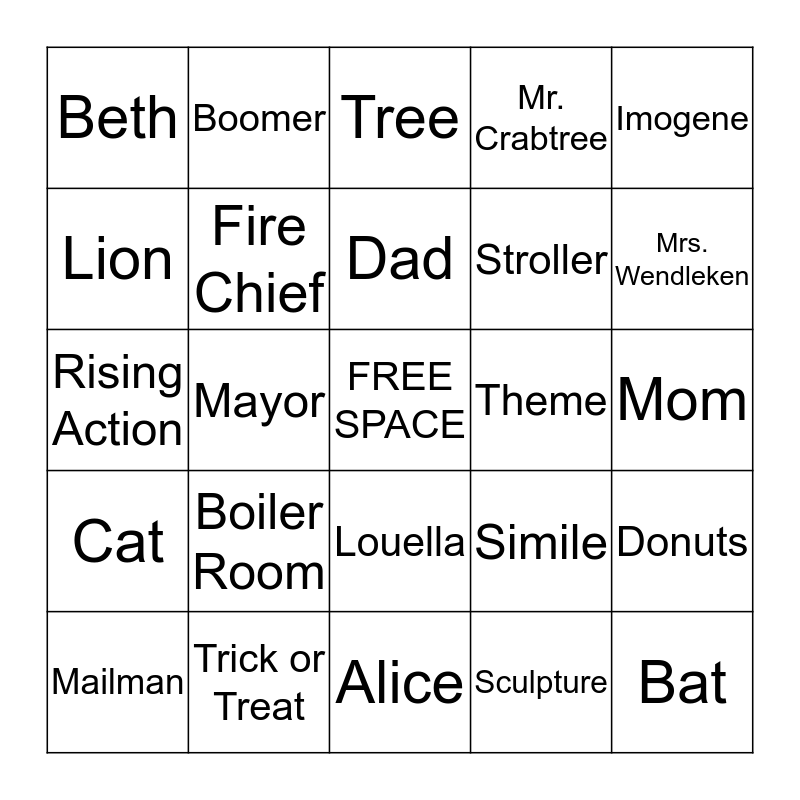 This bingo card has a free space and 24 words: Boiler Room, Trick or Treat, Dad, Mailman, Imogene, Beth, Lion, Boomer, Theme, Louella, Stroller, Rising Action, Simile, Donuts, Fire Chief, Sculpture, Mom, Tree, Mrs. Wendleken, Mayor, Bat, Cat, Mr. Crabtree and Alice.